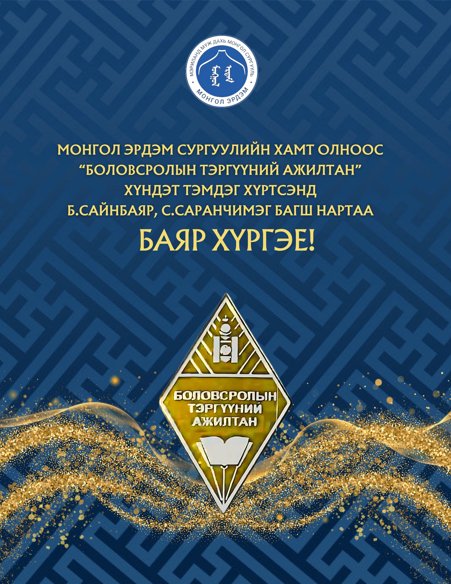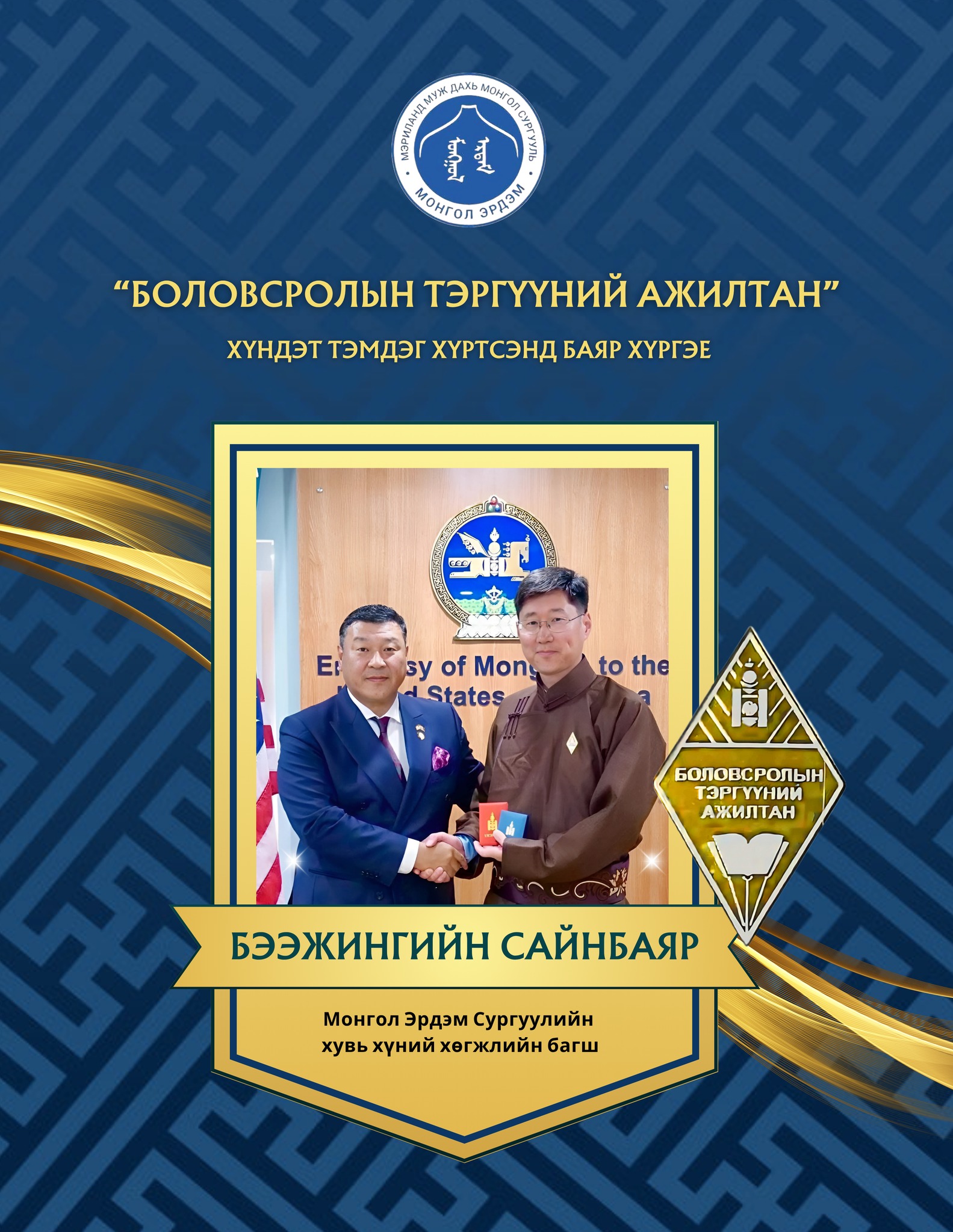 Монгол Эрдэм сургуулийн багш Б.Сайнбаяр, С.Саранчимэг нар Монгол улсын "Боловсролын тэргүүний ажилтан" цол тэмдэгээр шагнууллаа. 👏👏 Энэхүү нэр хүндтэй шагналыг Тулгар төр байгуулагдсаны 2234, Их Монгол Улсын 819, Ардын хувьсгалын 104, Ардчилсан хувьсгалын 35 жилийн ойг тохиолдуулан Монгол улсаас Америкийн нэгдсэн улсад суугаа бүрэн эрхэт Элчин сайд Ө.Батбаяр ёслол төгөлдөр гардуулав. Сэтгэлтэй, зүтгэлтэй, хөдөлмөрч багш нартаа маш их талархаж буйгаа илэрхийлэхийн ялдамд томоос том баяр хүргэж цааш цаашдын ажил үйлсэд нь өндрөөс өндөр амжилт хүсье.🌟 Та бүхний уйгагүй хөдөлмөр, хичээл зүтгэл, шавь нараа гэх халуун сэтгэлээр Монгол ирээдүйгээ бүтээж байгаадаа туйлын баяртай байна. 🇲🇳